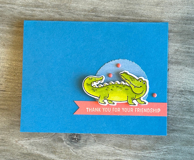 A perfectly clean and simple card, Christy! The green crocodile looks amazing with the Azure Afternoon card base. I hope you are feeling better, my friend! Thank you for playing in my clean and simple friendship challenge at The Paper Players this week!