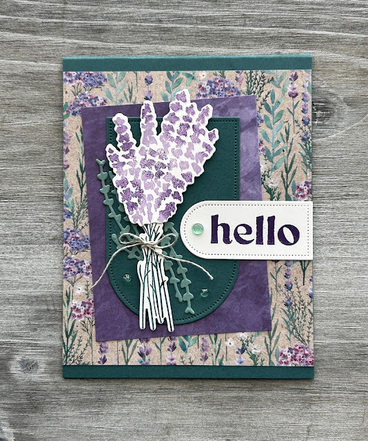 Accessories: Painted Lavender dies, Everyday Arches dies, linen thread, Tinsel Gems, Dimensionals, Wink of Stella